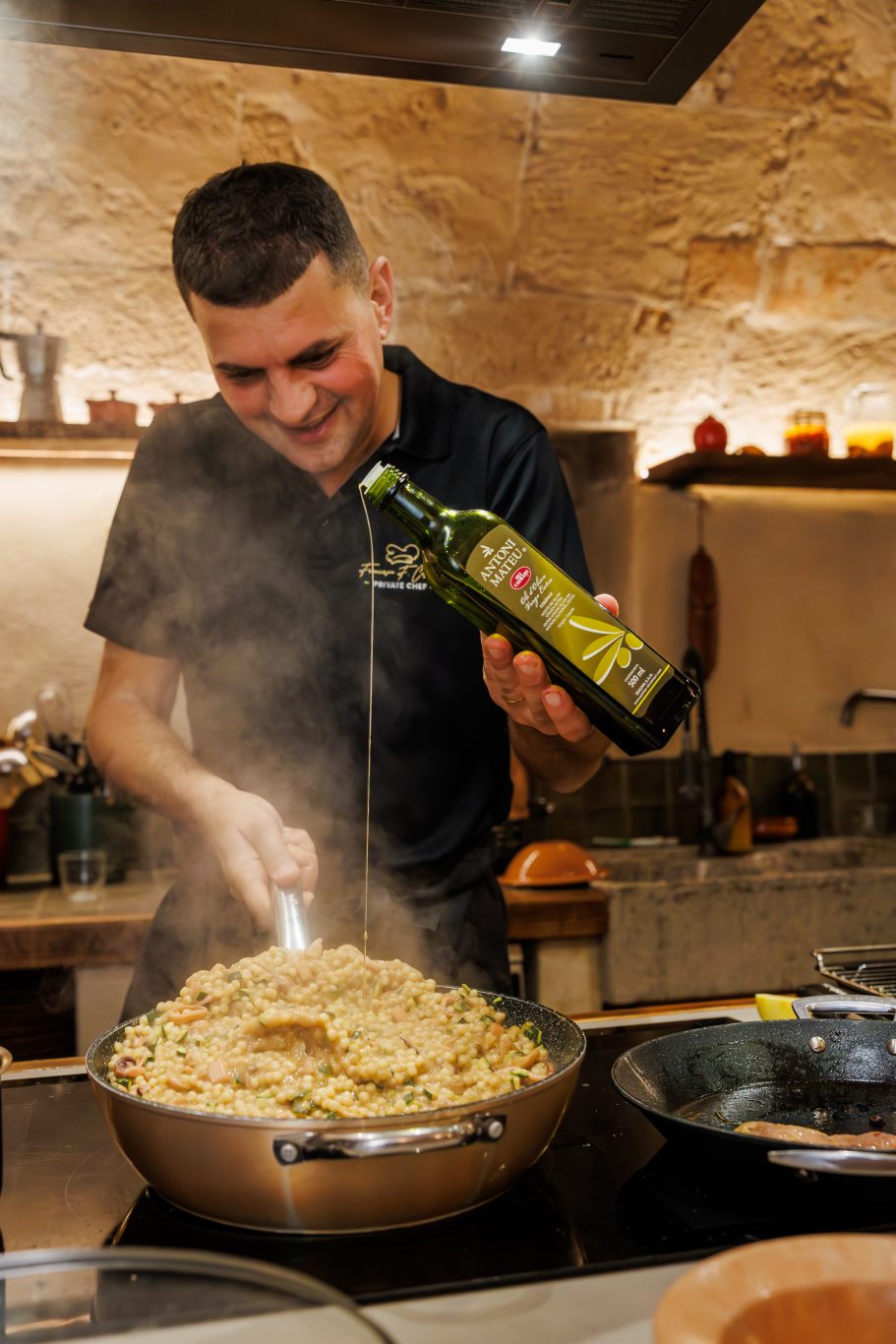 Der erste Hauptgang war ein Gericht, das deutlich den Wert der Beauftragung eines Privatkochs für Veranstaltungen verdeutlichte: die Fähigkeit, komplexe Zubereitungen zu bearbeiten und sie zum richtigen Zeitpunkt zu servieren. Ich bereitete geröstete sardische Fregola mit Tintenfisch- und Kalmarragout, Tartar aus roten Garnelen, knuspriger Zucchini und Schnittlauchöl zu. Die Idee war, das Meer, die Textur und die Technik in einem raffinierten, aber zugänglichen Ergebnis zu kombinieren.