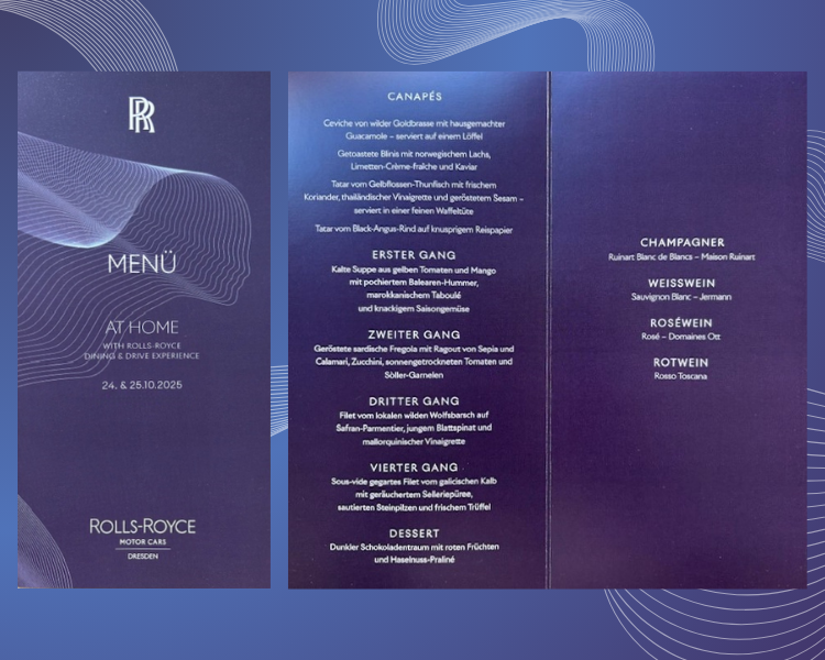 If you are in the comparison phase for a product presentation or a brand experience, take this case as a reference. The pairing of brand values (elegance, innovation, discretion) and gastronomy is worked on from the first meeting: key moments are set and decisions are made on how the cuisine will highlight them. At the Rolls-Royce event, this translated into an exclusive menu, with clean textures and precise technique, with a serene rhythm that reflected the ‘quiet luxury’ of the electric models.
